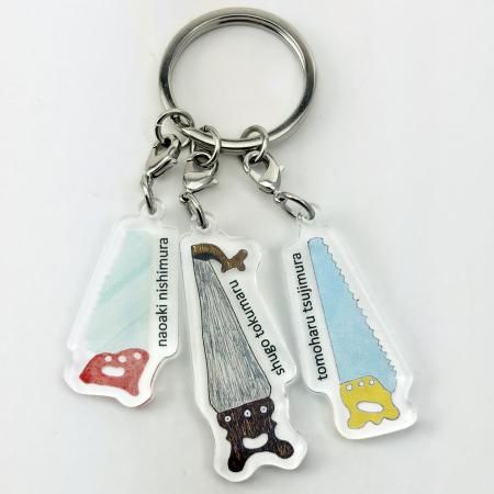 メンバーそれぞれが弾いているのこぎりを、それぞれが手描きしたのこぎりイラストを3連のキーホルダーにしました。